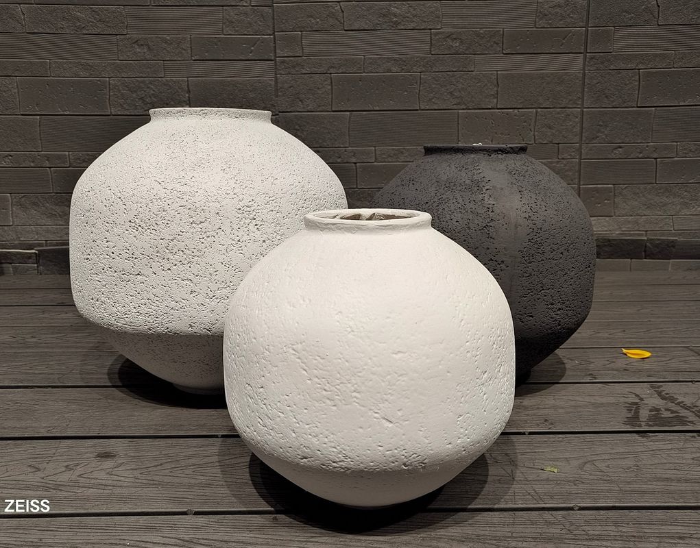 粘土と繊維のブレンドから構築されたこれらのプランターは、表面にユニークなテクスチャーを示し、視覚的な魅力を増します。手彫りの仕上げにより、モダンな外観がさらに向上し、スタイリッシュな装飾要素として際立っています。